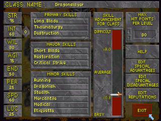 Backstabbing : умение неслышно подкрасться к противнику и нанести безответный удар; Языковые навыки. По ходу игры необходим сбор информации, и обладание этими навыками придает игре особый вкус. Кроме этого, знание языков нередко помогает избежать кровопролитного сражения. Centaurian : язык кентавров; Прочие навыки. В программе есть еще немало важных и нужных навыков, которые отнесены к разряду прочих: Etiquette : этикет. Считайте, что это как бы "язык" для общения с благородными персонами. Знание этикета влияет на отношение к вам со стороны дворянской части населения провинций. В судебных заседаниях этот навык позволяет более убедительно приводить и отстаивать свои доводы; Параметры навыков и умений В поле навыков обозначены три раздела: • Primary skills - первичные навыки. В качестве первичных вы можете выбрать три навыка, и всем будет назначено стартовое значение, равное 30 баллам; • Major skills - основные навыки. Несмотря на название "основные", они все-таки не столь важны, как первичные. Их тоже можно выбрать три, и всем им в начале игры будет установлено примерно по 20 баллов; • Minor skills - шесть дополнительных навыков. Выберите их, и они получат в среднем по 15 баллов. Все остальные навыки автоматически относятся в раздел Miscellaneous skills, и им устанавливается стартовое значение, равное примерно 5 баллов. Балансировка героя Генерируя персонажа, обратите внимание на то, насколько гармоничной получается его личность. Индикатором служит вертикальная шкала сбалансированности, указывающая на скорость развития навыков. Стрелка в виде кинжала поначалу находится в средней части шкалы. Наличие особых достоинств поднимает ее вверх, а наличие специальных недостатков - опускает вниз. Понятно желание поднять достоинства героя как можно выше, но за это придется расплачиваться. Чем выше находится стрелка, тем медленнее в игре будут расти навыки героя. Лучший вариант состоит в том, чтобы и достоинства приподнять и не дать стрелке подняться слишком высоко. При балансировке вы можете управлять: • регулировкой приращения жизненной силы (Hit Points); 1. Приращение HP при изменении уровня развития героя может происходить в диапазоне от 4 до 30 пунктов за один раз. Вы сами вправе выбрать величину этого приращения. Чем большее число вы установите, тем сильнее будет эффект от каждого повышения уровня опытности, но тем реже такой скачок будет происходить. Соответственно, чем большее число вы здесь зададите, тем выше поднимется стрелка на шкале сбалансированности. 2. Опустить стрелку можно, если задать герою набор специальных недостатков с помощью кнопки Edit special disadvantages. Возможные недостатки: • Phobia to animals (daedra, humanoid, undead) - боязнь животных (демонов, гуманоидных рас, "нежити"); • Low tolerance to disease (fire, frost, magic, paralysis, poison, shock) - пониженная стойкость к болезням (огню, холоду, магии, параличу, ядам, электрическим ударам); • Critical weakness to disease (fire, frost, magic, paralysis, poison, shock) - опасное отсутствие защиты от тех же невзгод; • Darkness-powered magery (lower magery in light, unable to cast in light) - магия тьмы (ослабление магии на свету, полная неспособность колдовать на свету); • Light-powered magery (lower magery in darkness, unable to cast in darkness) - магия света (ослабление магии в темноте, полная неспособность колдовать в темноте); • Damage from holy places (from sunlight) - повреждение от пребывания в святых местах (от солнечного света); • Forbidden armor type - запрещение использования какого-либо вида доспехов