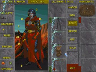 В центре экрана находится фигура героя с отмеченными для каждой части тела параметрами защищенности. Правее фигуры героя в столбик изображены предметы, которые находятся в его владении: они сортируются кнопками в верхней части экрана: • Weapons & Armor - доспехи и оружие; • Magic Items - магические предметы (включая и оружие, и доспехи, и одежду), они всегда окружены мерцающим ореолом; • Clothing & Miscellaneous - одежда, книги, бумаги и прочие мелочи. Не забывайте периодически сюда заглядывать. Важные деловые письма не всегда передаются курьером из рук в руки. В тех случаях, когда вас, например, не было дома, письма могут складываться в этот раздел инвентаря; • Ingredients - компоненты для приготовления волшебных напитков. Еще правее аналогичное поле, представляющее, в зависимости от ситуации, вещи на теле побежденного врага, на полке магазина, в фургоне героя или просто на земле. Это поясняется рисунком сверху. Расположенные по вертикали кнопки задают режимы работы с предметами: • Wagon - показ содержимого фургона. Вещи в фургоне не рассортированы, фургон недоступен в лабиринтах, но имеет грузоподъемность в 1000 кг и очень полезен для перевозки трофеев; • Info - информационный режим. Позволяет узнать характеристики предмета; • Equip - режим экипировки. После его включения и указания на предмет он надевается на фигуру героя (конечно, если нет запрета на его тип или материал). Оружию, вложенному в руку героя, требуется дополнительно несколько секунд для перехода в состояние готовности; • Remove - режим удаления. Этот режим позволяет снимать с героя оружие или доспехи. Таким же образом можно переносить предметы из одного столбца в другой; • Use - режим использования предметов. Доспехи надеваются, оружие берется в руку, бумаги читаются, магические напитки выпиваются; • Gold - возможность выбросить часть золота. Это предусмотрено на случай, когда герой нагружен до предела, а предмет, который он хочет подобрать, ценнее, чем его вес в золоте.