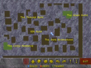Экран Spellbook слева содержит список заклинаний, которые знает герой, а справа - краткое описание выбранного заклинания. Если указать мышкой на краткое описание, то появится полное описание заклинания. В нижней строке экрана имеются кнопки для прокрутки списка вверх и вниз, а также для стирания ненужного (лишнего) заклинания. Для исполнения заклинания требуется двойное нажатие кнопки мыши на выбранном названии (цифра перед ним - цена заклинания в единицах магической силы Spell Points). Если у героя в данный момент не хватает энергии, то применить заклинание невозможно. Карта окрестностей вызывается нажатием левой кнопки мыши на кнопке с изображением свитка. В нижней части карты есть компас (кроме города), кнопка переключения двухмерного-трехмерного режимов (карта в городе всегда двумерна), четыре стрелки для сдвигания карты, две стрелки для ее вращения и две стрелки для подъема-спуска (карта при этом масштабируется). В городе вся карта заполнена сразу. Здания нарисованы одним из трех цветов. Обычные дома - коричневые, таверны - зеленые, гильдии и храмы - синие. Тайные гильдии изображены так же, как и обычные дома. Но если вы член этой гильдии, то на вашей карте на этом доме будет написано название.