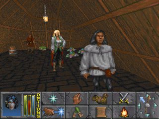 Курсор перемещается по всему экрану, около центра экрана он крестообразный, при удалении от центра превращается в стрелку для указания направления движения, а в поле кнопок становится косой стрелкой, символизируя возможность нажатия на них. Назначение кнопок трехмерного экрана: Портрет героя на синем фоне: нажатие мышкой на нем выводит информационный экран Изменение цвета фона сигнализирует о том, что герой болен, почти мертв и т.п. Три вертикальных индикатора - зеленый, красный и синий - обозначают количество здоровья (Hit Points), степень утомления (Fatigue) и количество оставшейся магической энергии (Spell Points). Вертикальная надпись Options вызывает панель управления игрой. Применение магии. После ее нажатия появляется книга заклинаний, в которой нужно выбрать заклинание при помощи мышки. Использование магического предмета или магического напитка. При этом появляется небольшое окно со списком вещей, которые можно использовать. Указатель режима взаимодействия. Это многофункциональная кнопка. Последовательные нажатия на нее вызывают появление следующих символов: • рука, вытаскивающая монету - воровской режим. В этом режиме указание на дверь осуществляет попытку взломать замок (в случае появления на верхнем крае надписи Door will not open вашего навыка lockpicking не хватило для взлома этого замка). Если вы укажете на городского прохожего, то это будет означать попытку залезть к нему в карман - в случае слабого навыка pickpocket ожидайте скорого появления городской стражи. Кстати, если дверь выдает сообщение This is magically held door, значит, она заперта заклинанием и чтобы ее открыть, необходимо поколдовать; • глаз - информационный режим. Указание на прохожего позволяет узнать его имя; на монстра - его название; на дом или магазин - название заведения. Если магазин закрыт, узнаете часы его работы; • протянутая рука - режим действия. Указание на прохожего вызывает попытку с ним заговорить; на труп монстра (если вы присели или нагнулись) - попытку его обыскать; на незапертую дверь - ее открывание; на рычаг - приведение в действие; • текстовая врезка - режим общения. Указание на вызывает попытку с ним заговорить; на монстра - попытку мирно договориться. Оружие должно быть убрано. Переключатель режима движения. Возможный выбор: ноги, лошадь (если она есть), фургон (если есть и лошадь, и фургон), корабль. Последний вариант, собственно, не является режимом передвижения - выбрав этот пункт меню, вы оказываетесь на своем корабле, опять же если он у вас есть. Там можно, например, оставить лишние вещи, а затем, выбрав режим ноги, вернуться на прежнее место. Естественно, в подземных лабиринтах двигаться можно только пешком. Кнопка с двумя мешками вызывает переход в инвентарный экран. Карта. Нажатие левой кнопки мыши вызывает режим локальной карты, правая кнопка мыши вызывает переход в походный режим (недоступен в лабиринте или здании). Команда перевода оружия в боевой режим. Отдых. Возможны 3 режима: • rest for a while - отдыхать определенное количество времени (до 99 часов);